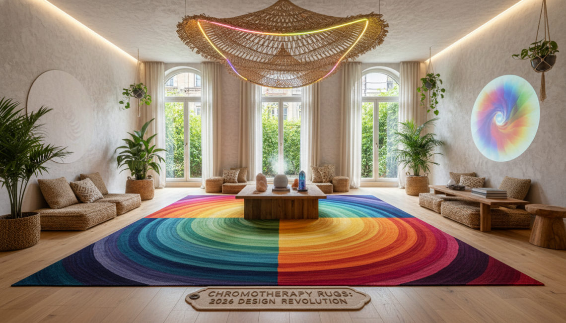 Explore the 2026 chromotherapy rugs trend. Discover how 'Art for the Floor' uses color frequency to transform bohemian wellness spaces into healing sanctuaries.