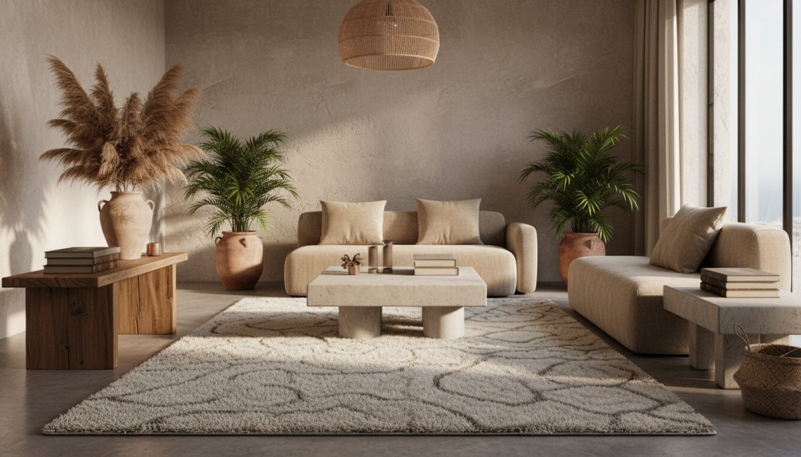 Discover the rise of Tadelakt-textured wool rugs in 2026. Explore how this Organic Brutalist trend is transforming Boho living with architectural, haptic depth.
