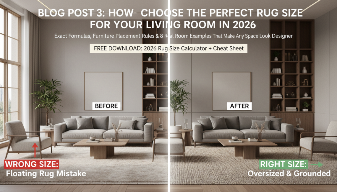 Master 2026 rug sizing with our expert guide. Discover exact formulas, furniture placement rules, and 8 real-world examples to transform your living room.